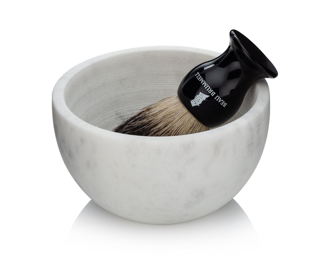 Submerge the Marble Shaving Bowl in hot water for 1-2 minutes to allow the marble to absorb as much heat as possible. Pour out hot water and squeeze a quarter size amount of Shaving Cream into the bowl. Moisten Shaving Brush with warm water, shake off the excess and create a lather using circular motions directly in the bowl. Add warm water as needed to reach desired lather.
